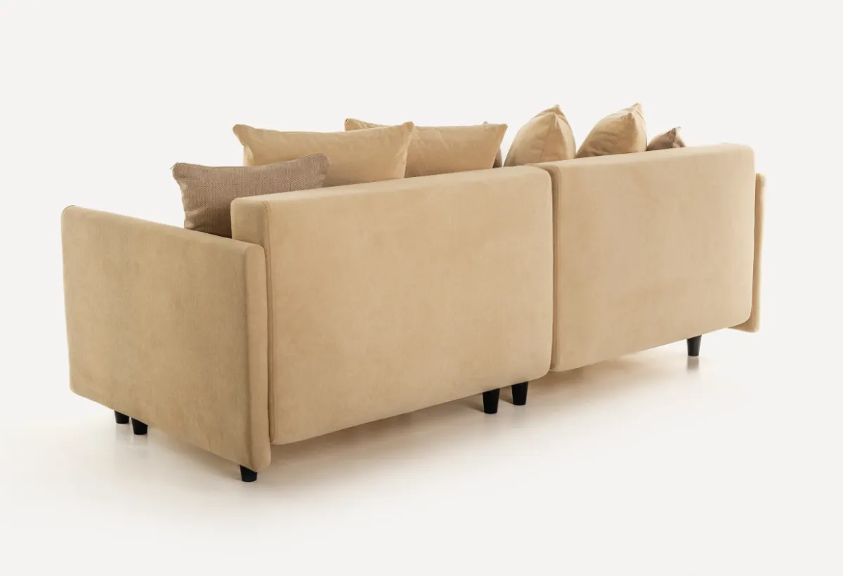 Качество, которое чувствуетсяДиван выполнен из прочных материалов: каркас из сосновых брусков и ортопедическая пружинная основа гарантируют долговечность и комфорт. Обивка из прочного и приятного на ощупь материала не потеряет форму даже через годы использования. Подушки, наполненные гипоаллергенным материалом, не сминаются и не теряют форму. А ещё их можно вынуть из чехлов и постирать — это важно, когда в доме есть дети или животные. Все детали продуманы: от надёжного механизма трансформации до лаконичного дизайна без лишних деталей.